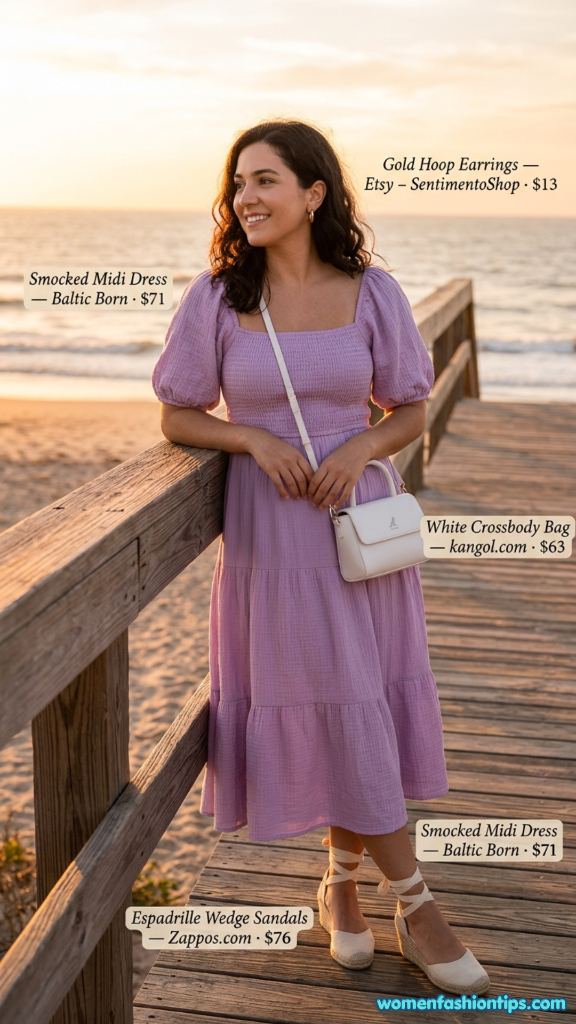 Lavender might just be the color of the summer — it’s soft, romantic, and endlessly flattering against sun-kissed skin. This smocked midi dress from Baltic Born has the kind of dreamy, feminine quality that makes you feel like the lead in your own vacation film. The square neckline and puff sleeves are classic without being dated, and the smocked bodice creates a flattering fit that moves with you. The tiered skirt adds volume and whimsy, swaying beautifully with each step. It’s one of those chic summer beach outfits women will reach for on the evenings they want to feel truly special.