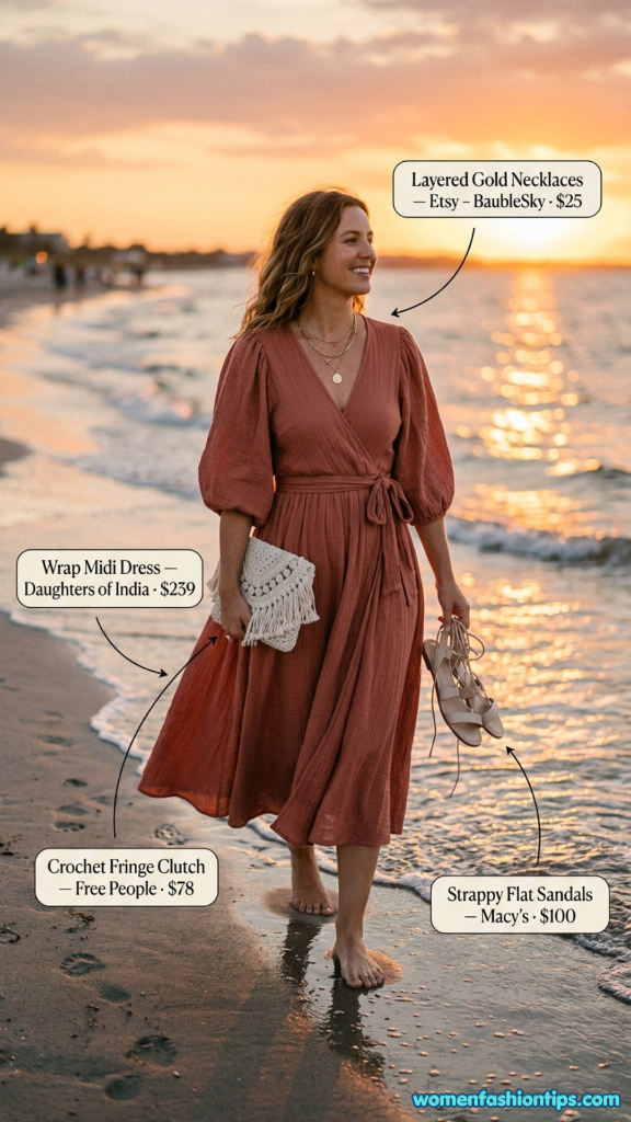 Shop This Look: The Layered Gold Necklaces from Etsy seller BaubleSky at $25 — shop them here. The Wrap Midi Dress from Daughters of India at $239 — grab it here. The Crochet Fringe Clutch from Free People at $78 — find it here. And the Strappy Flat Sandals from Macy’s at $100 — shop them here.