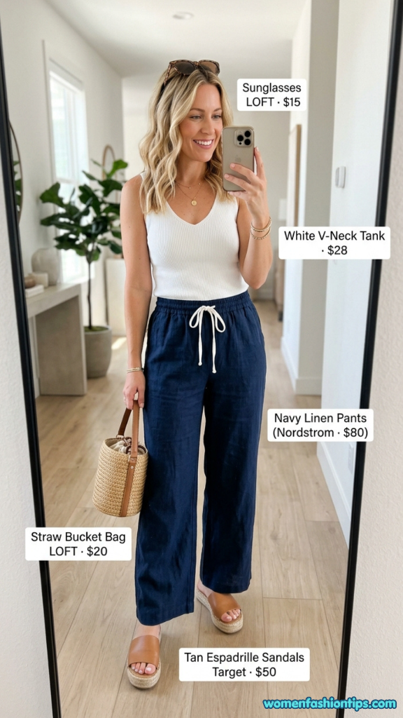 Shop This Look: The Sunglasses are from LOFT at $15 — shop them here. The White V-Neck Tank at $28 is a wardrobe staple — grab it here. The Navy Linen Pants are from Nordstrom at $80 — find them here. You can snag the Straw Bucket Bag from LOFT for just $20 — shop it here. And the Tan Espadrille Sandals are from Target at $50 — check them out here.