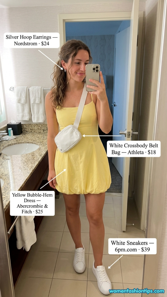 Shop This Look: The Silver Hoop Earrings are from Nordstrom at $24 — shop them here. The White Crossbody Belt Bag by Athleta runs $18 — grab it here. The Yellow Bubble-Hem Dress from Abercrombie & Fitch is just $25 — find it here. And the White Sneakers from 6pm.com are $39 — check them out here.