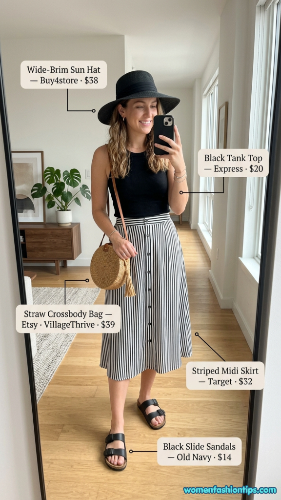 Shop This Look: The Wide-Brim Sun Hat from Buy4store is $38 — shop it here. The Black Tank Top from Express at $20 — grab it here. Loving the Straw Crossbody Bag from VillageThrive on Etsy for $39 — find it here. The Striped Midi Skirt from Target is just $32 — check it out here. And the Black Slide Sandals from Old Navy at $14 — snag them here.