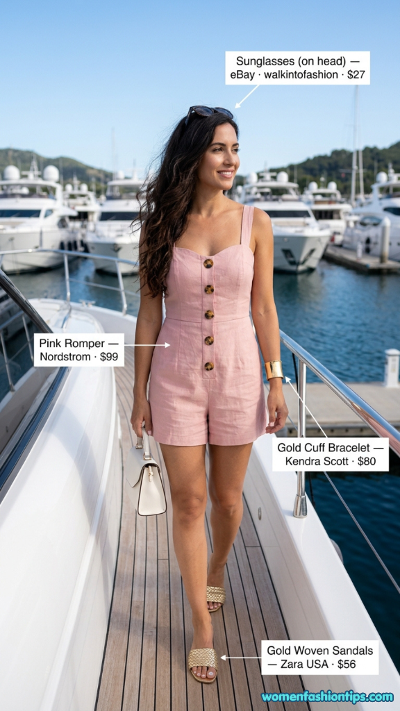 There’s a softness to blush pink that makes it one of summer’s most flattering colors, especially against sun-kissed skin and sparkling water. This linen romper with its sweetheart neckline and oversized tortoiseshell buttons is the definition of a summer yacht outfit idea that feels elevated but completely effortless. It’s a one-and-done piece — no coordinating separates, no layering decisions, just slip it on and you’re immediately the best-dressed person on the boat.