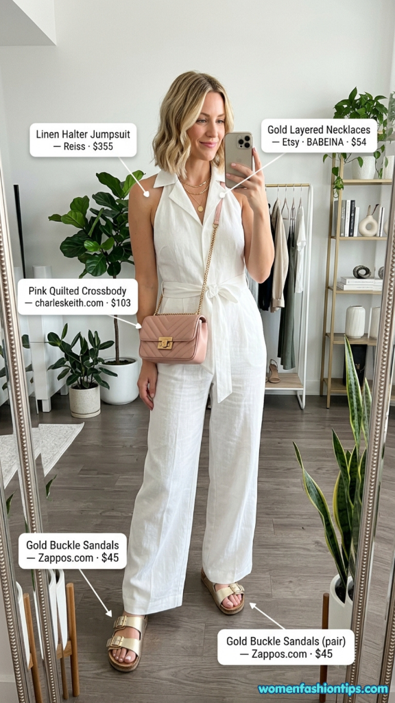 Shop This Look: The Linen Halter Jumpsuit from Reiss is $355 — shop it here. The Gold Layered Necklaces from BABEINA on Etsy at $54 — find them here. The Pink Quilted Crossbody from charleskeith.com is $103 — grab it here. And the Gold Buckle Sandals from Zappos.com at $45 — check them out here.