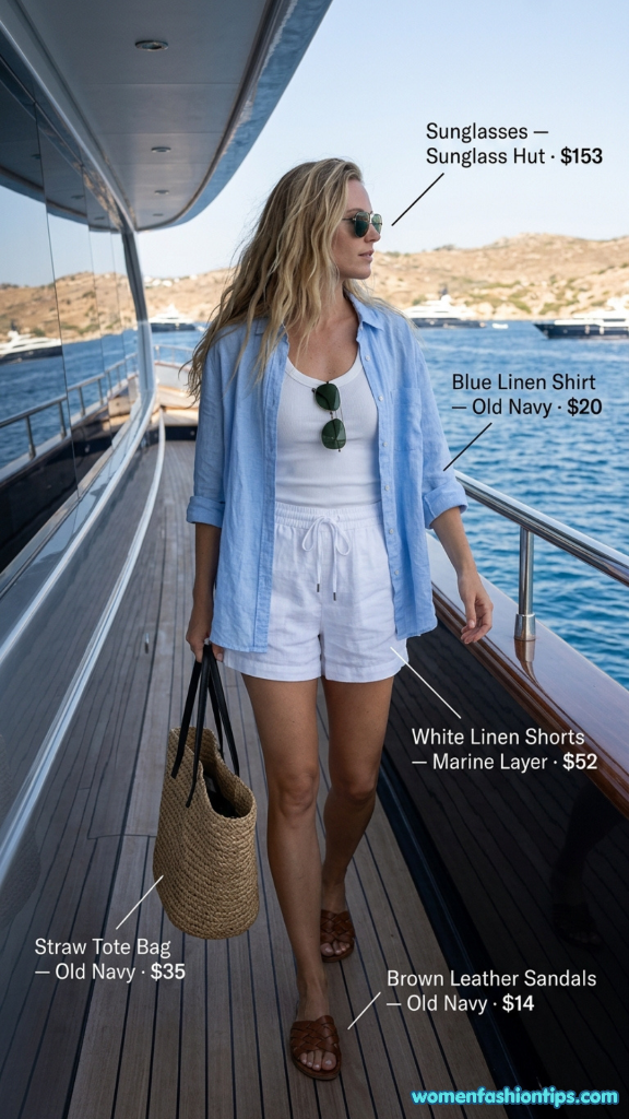Old Navy’s linen shirt collection has been a standout this season, offering that perfect lived-in softness at an accessible price. The key is wearing the shirt completely unbuttoned and letting it function as a light layer rather than a structured top. Marine Layer’s white linen shorts in the $52 range have a beautiful drape that keeps them from looking sloppy, and the drawstring waist means total comfort. Aviator sunglasses from Sunglass Hut — while a bigger investment at $153 — add a polished finishing touch and, more importantly, protect your eyes on the glare-heavy water.