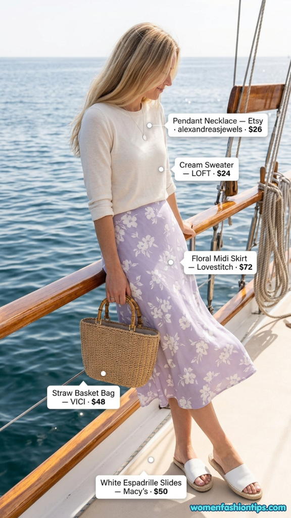 Not every boat day happens under blazing sun. Some of the most magical ones are the cooler mornings or late-afternoon sails when the light goes soft and golden, and for those moments, you want something with a little more warmth. This cream crewneck sweater paired with a lavender floral midi skirt is romantic, gentle, and utterly perfect for a sunset sail. The soft purple florals against the cream knit create a palette that feels like a watercolor painting come to life.