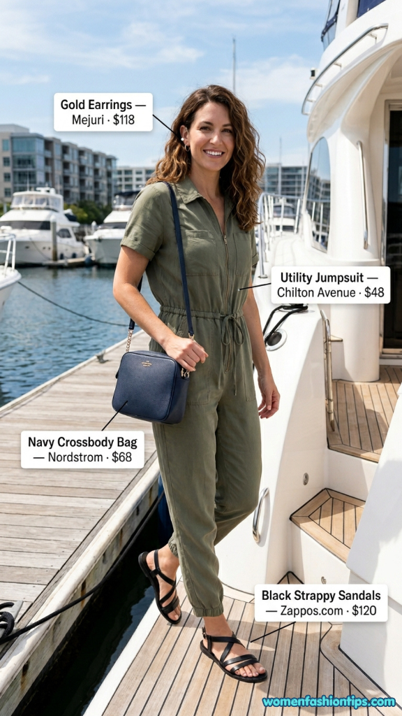 The jumpsuit from Chilton Avenue at $48 offers fantastic value for a piece this versatile. The utility detailing — the collar, the zip, the gathered waist — gives it enough structure that it reads as intentional rather than casual. Pair it with black strappy sandals from Zappos for a sleek contrast, and add a structured navy crossbody bag from Nordstrom to keep your phone and keys secure and accessible. Gold earrings from Mejuri add a touch of warmth that complements the olive beautifully.