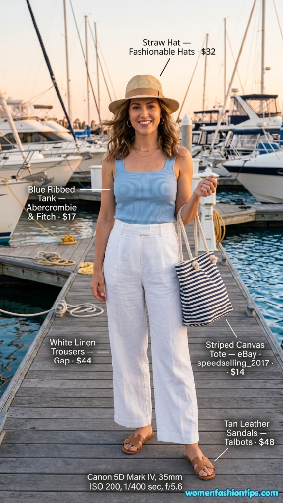 Abercrombie & Fitch has been producing beautifully fitted ribbed tanks that sit perfectly against the body without being too tight — at $17, they’re a steal. Gap’s white linen trousers at $44 have that ideal wide-leg drape that moves beautifully in a breeze. The straw hat from Fashionable Hats adds structure and sun protection, while tan leather sandals from Talbots ground the look with a warm, natural tone. The striped canvas tote from eBay is a charming, budget-friendly accessory at just $14 that reinforces the nautical theme without being heavy-handed.