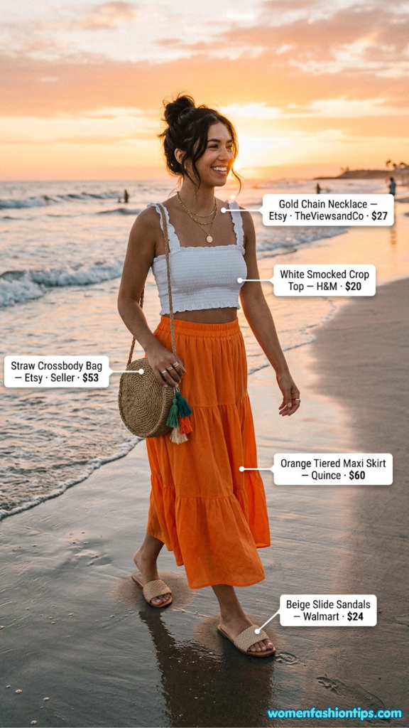 H&M’s smocked crop tops at $20 have become a summer staple for good reason — the stretchy smocked bodice is universally flattering and stays in place through all kinds of activity. The orange tiered maxi skirt from Quince at $60 has that flowing, bohemian quality that makes every step look cinematic. Beige slide sandals from Walmart at $24 keep things casual and beach-appropriate. Layer a gold chain necklace from TheViewsandCo on Etsy and carry a round straw crossbody with tassel details for that perfect coastal bohemian vibe.