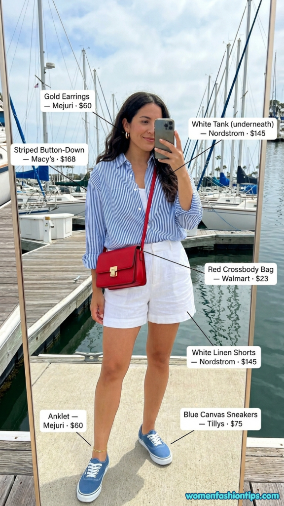 Shop This Look: The Gold Earrings from Mejuri at $60 — shop them here. The Striped Button-Down from Macy’s is $168 — find it here. The White Tank from Nordstrom at $145 — grab it here. The Red Crossbody Bag from Walmart is $23 — check it out here. The White Linen Shorts from Nordstrom at $145 — shop them here. The Anklet from Mejuri is $60 — find it here. And the Blue Canvas Sneakers from Tillys at $75 — snag them here.