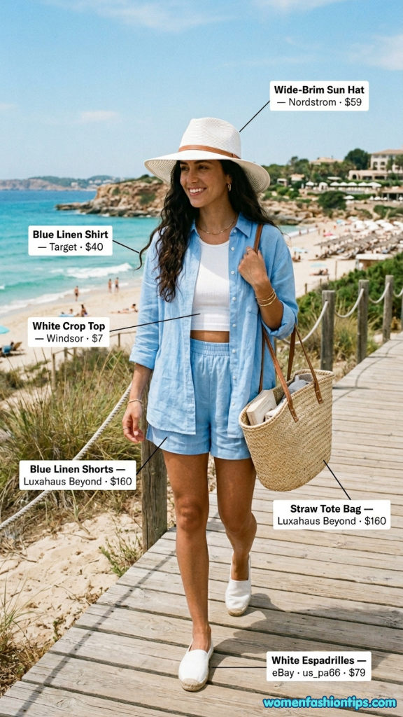 Shop This Look: The Wide-Brim Sun Hat from Nordstrom is $59 — shop it here. The Blue Linen Shirt from Target at $40 — find it here. The White Crop Top from Windsor is just $7 — grab it here. The Blue Linen Shorts from Luxahaus Beyond at $160 — check them out here. The Straw Tote Bag from Luxahaus Beyond is $160 — shop it here. And the White Espadrilles from eBay at $79 — find them here.