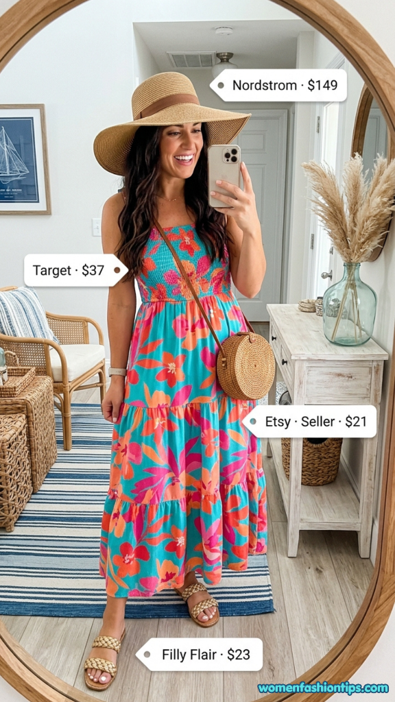 Nordstrom carries this stunner at $149, and while it’s a bigger investment than some of the other looks on this list, it’s a dress you’ll reach for all summer long — boat days, beach vacations, summer weddings, outdoor dinner parties. A wide-brim straw hat from Target at $37 adds shade and visual balance to the bold print, while woven slide sandals from Filly Flair at $23 complement the warm tones in the fabric. A small round straw crossbody from Etsy for $21 keeps things hands-free and adds another layer of textural interest.