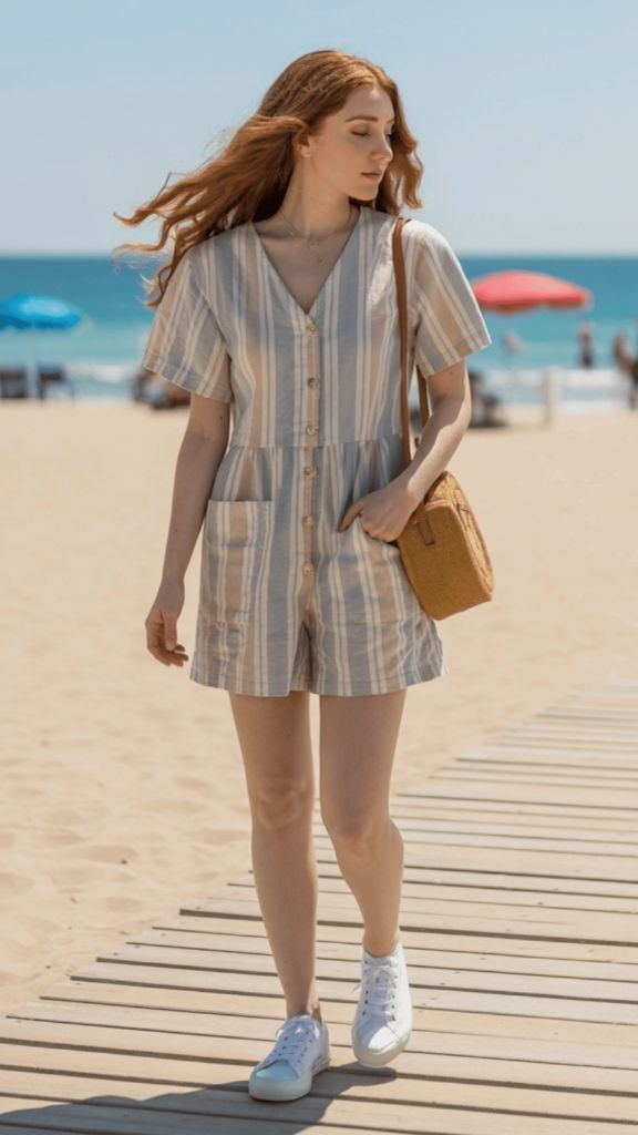 If I were recreating it, I’d search for something close to the Old Navy Linen-Blend Button-Front Romper or the Gap linen-cotton utility playsuit. A woven crossbody keeps your hands free, and I’d always add a touch of Moroccanoil Treatment Light through the hair if there’s any ocean breeze involved. Rompers wrinkle, so I like to embrace that lived-in texture rather than fight it.