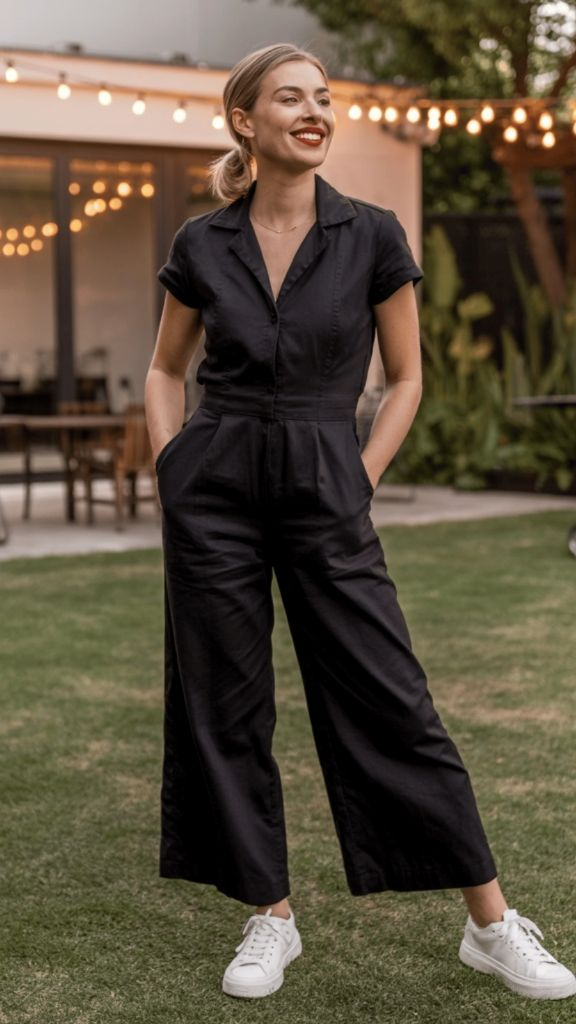 Some summer looks feel like instant confidence, and this black short-sleeve jumpsuit is one of them. The tailored bodice, slightly cropped wide leg, and white sneakers create a silhouette that feels strong but not severe. I love how the evening lights and outdoor setting make it feel dressed up without losing comfort. For summer mom outfit trends that move from daytime to casual dinner, this kind of one-piece is gold.