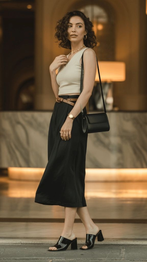 A soft neutral knit tank with a black midi skirt always feels elegant to me, especially when the accessories are minimal and the shoes have a bit of shine. This look is quiet, feminine, and beautifully grown-up. It’s one of those comfortable mom outfit ideas that works when I want to feel dressed but not flashy, whether for date night, a hotel dinner, or an evening out after a long day.