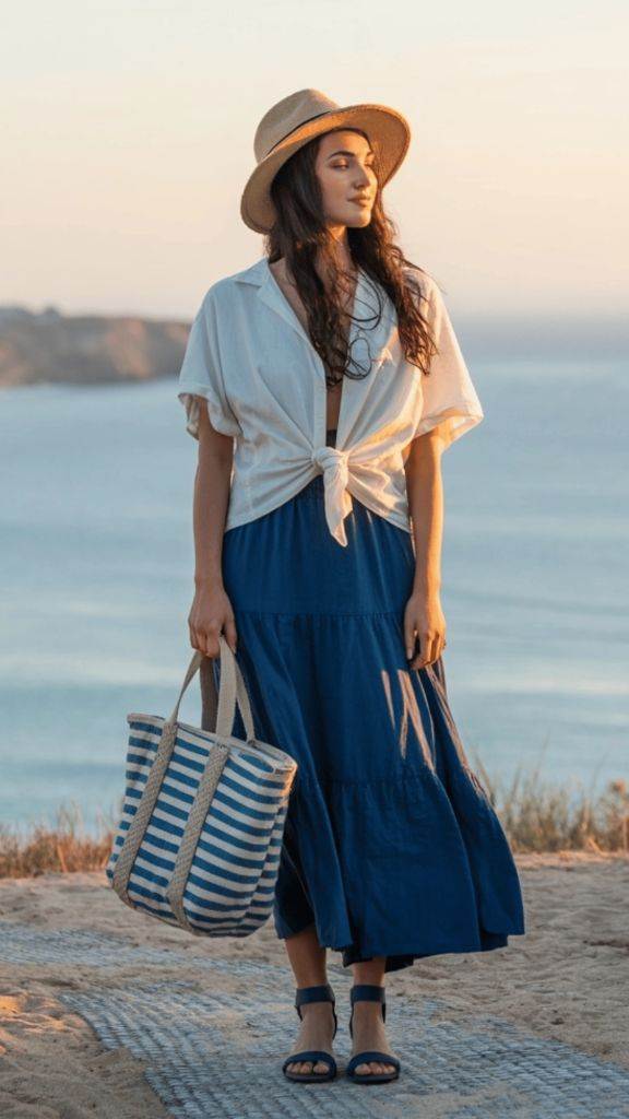 There’s a dreamy, windswept quality to this outfit that feels like vacation without becoming costume-y. The tied white shirt, blue tiered skirt, striped tote, and sun hat all work together in a way that feels breezy and grounded. For moms looking at mom friendly summer dresses alternatives, this kind of skirt-and-shirt combination offers the same softness with a little more styling flexibility.
