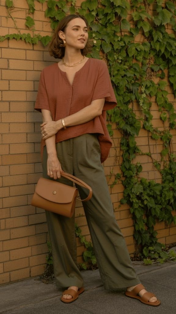 I adore the earthy palette of this outfit. The rust blouse, olive relaxed trousers, and warm tan accessories feel rich without feeling heavy, which is such a nice trick in summer. The fabrics look airy, the lines are soft, and the whole mood is quietly elevated. For comfortable summer fashion women can wear beyond basic black and white, this kind of tonal dressing feels incredibly refreshing.