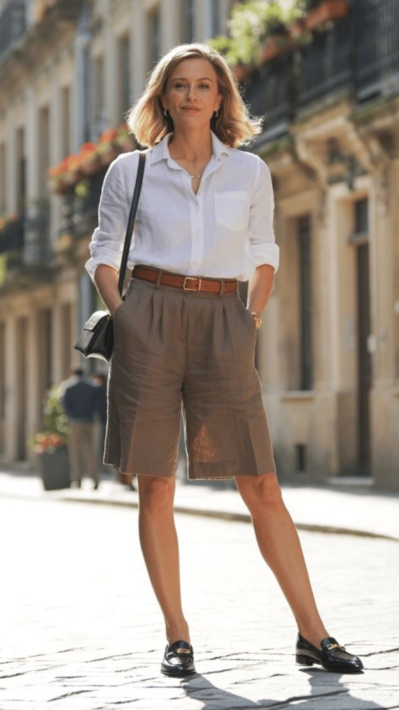 Long linen-blend bermuda shorts with a tucked white shirt can look incredibly chic when the proportions are right. I love how this outfit feels airy and European, with the rolled sleeves, tan belt, and simple loafers giving it structure. It’s a smart answer for moms who want mom outfits summer ideas beyond jeans or dresses, especially on the hottest days when coverage still matters.