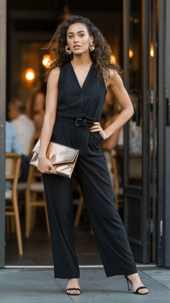 Some summer nights call for a look that’s streamlined, dramatic, and still surprisingly wearable. This sleeveless black jumpsuit does exactly that, with a fluid shape, defined waist, and metallic clutch that catches just enough light. I love how it feels sophisticated without becoming stiff. For moms who want stylish mom outfits summer evenings can actually handle, this kind of one-piece is a quiet power move.
