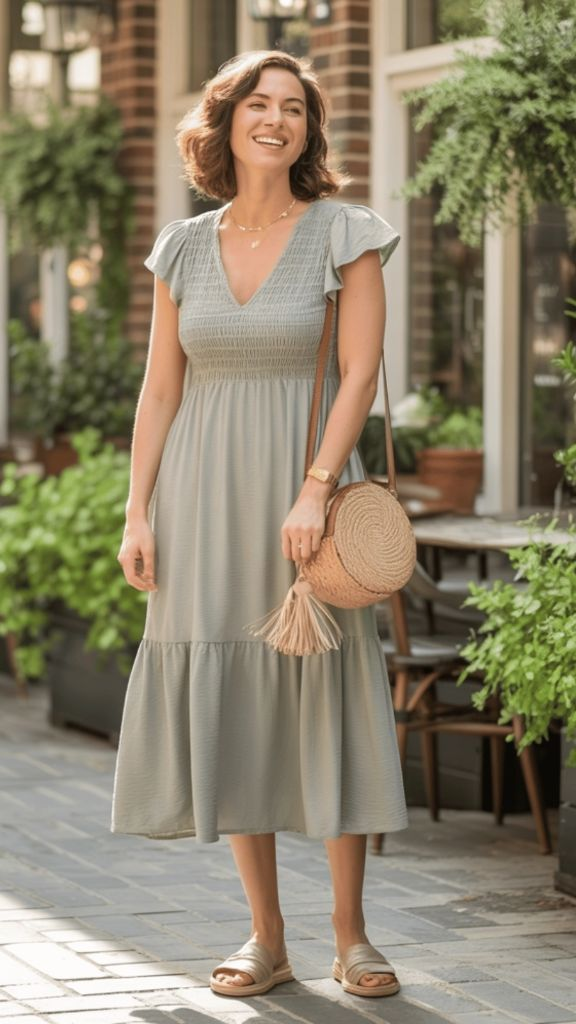A smocked gray midi dress with flutter sleeves and a round woven bag is one of those outfits that feels immediately calming. I love the gentle volume, the airy texture, and the way the neutral shade keeps everything feeling quiet and elegant. When I want casual mom style outfits that still feel feminine and polished, a dress like this is exactly where I start.