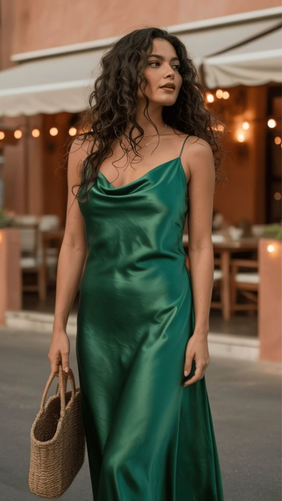 A satin slip dress in rich green can feel daring, but this version still reads relaxed because of the loose hair, woven tote, and warm outdoor setting. I love how it catches the light without looking overly formal. When the heat is high and I want comfortable summer fashion women can actually move in, a draped dress like this feels like an instant mood lift.