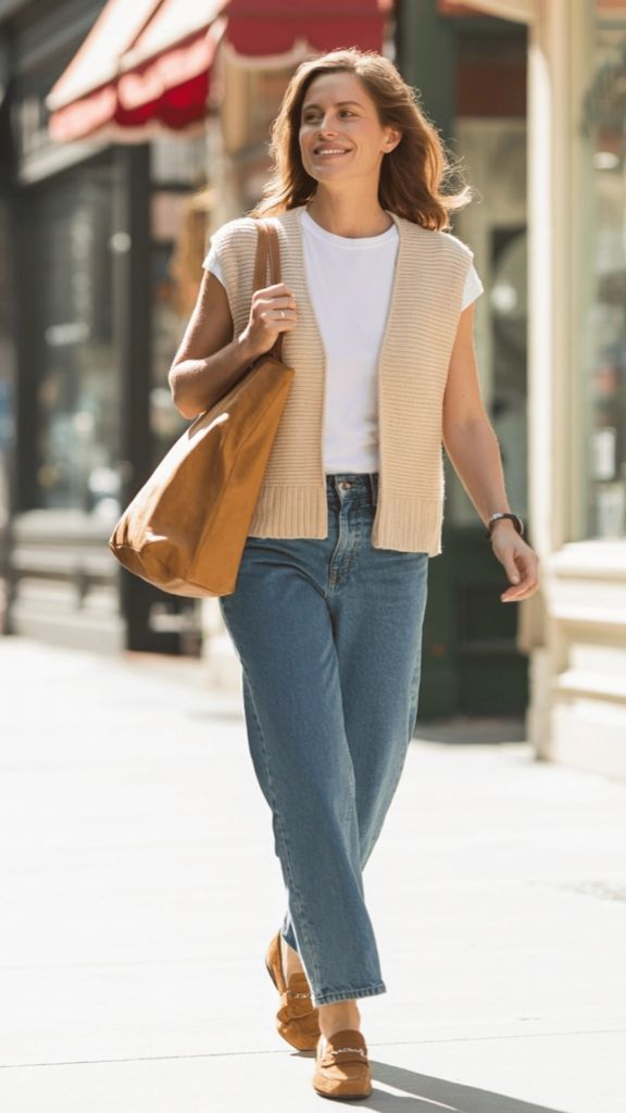 I’d try the Quince cotton cashmere sweater vest over a COS or Everlane crewneck tee, then add Levi’s Ribcage straight jeans. If you’re worried about heat, choose an open-knit or lighter gauge vest and keep the tee fitted underneath. Tan loafers or mules pull out the warmth of a large tote and make the whole look feel softer.