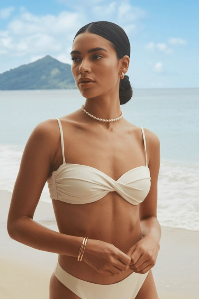 Minimalism and swimwear have become inseparable in 2026, and this cream twist-front bandeau with delicate spaghetti straps and matching high-waisted bottoms is the quiet centerpiece of that movement. The twist detail at the bust gives the top visual interest without any hardware or embellishment — it’s all about the fabric manipulation, the way the material wraps and catches shadow. Paired with a pearl choker and simple gold bangles, this is modern bandeau swimwear at its most refined. The warm cream tone against sun-warmed skin creates a tonal effect that’s both romantic and effortlessly chic.