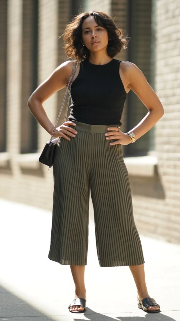 There’s a quiet power in pairing a fitted black ribbed tank with olive green pleated culottes, and this look captures it perfectly. The structured knit top hugs the body while the wide-leg culottes flow with every step, creating a silhouette that feels both grounded and graceful. The olive tone has this earthy warmth that feels so right for early summer evenings — think rooftop dinners and long walks through the city after the sun dips low. This is pleated summer culottes styling at its most effortless and confident.