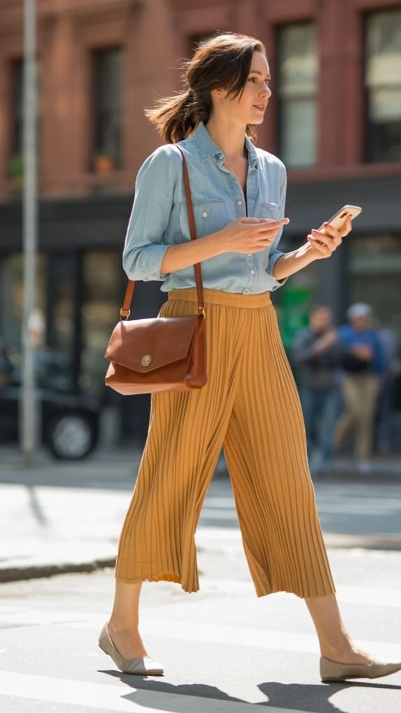 Something about a light-wash chambray shirt tucked into warm golden pleated culottes makes me think of Parisian women who somehow look perfect buying bread at 7 a.m. The mustard-gold tone of these culottes catches the sunlight in a way that feels almost liquid, and the soft pleating gives the whole lower half this beautiful movement that photographs like a dream. Paired with the relaxed ease of a denim shirt, it’s the kind of summer culottes outfit that transitions from a museum afternoon to a café terrace without missing a beat.