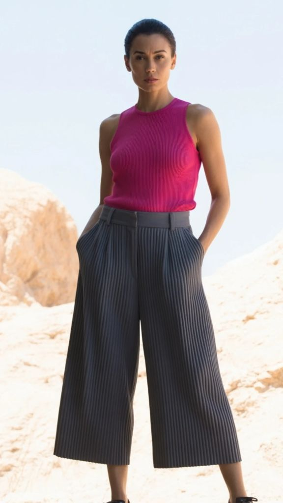 If you’ve been hesitant to try a bold color with your culottes, let this be the look that changes your mind. A vibrant fuchsia ribbed tank against charcoal pinstripe pleated culottes is arresting in the best possible way — the kind of outfit that makes people look twice and then smile. The culottes here are more tailored, with front pleats and a structured waistband, which gives them a trouser-like quality that balances the playful energy of the hot pink top. This is what chic culottes summer fashion looks like when you’re not afraid to have fun.