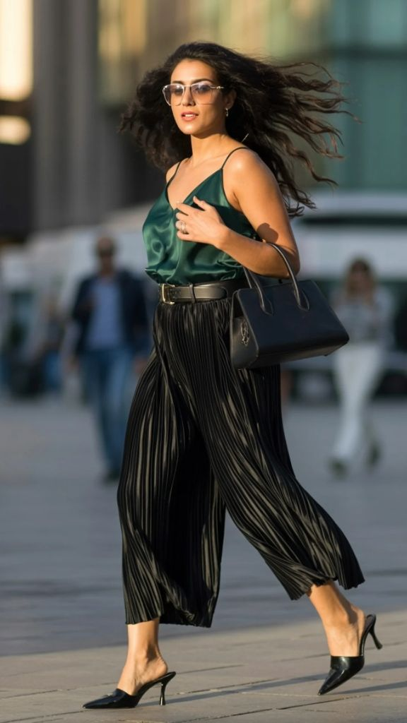 This is the look that proves pleated culottes belong at dinner parties, not just daytime errands. An emerald green silk camisole — the kind with delicate spaghetti straps and a liquid drape — paired with black pleated culottes that catch hints of gold as they move. The whole outfit feels like it belongs in a European city at dusk, with warm light bouncing off cobblestones and a glass of something sparkling in your hand. Pleated culottes styling ideas don’t get much more glamorous than this without tipping into formal territory.