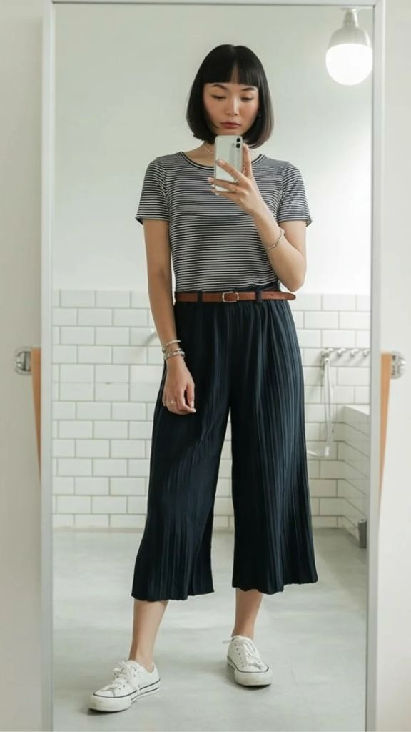 Not every culotte outfit needs to be elevated — sometimes the best version is the simplest one. A black-and-white striped tee, tucked into navy pleated culottes, cinched with a thin brown leather belt, and finished with white canvas sneakers. That’s it. That’s the whole formula. And yet this look has more personality than most “try hard” outfits I’ve seen this season. The casual summer culottes outfit is alive and well, and it looks exactly like this.