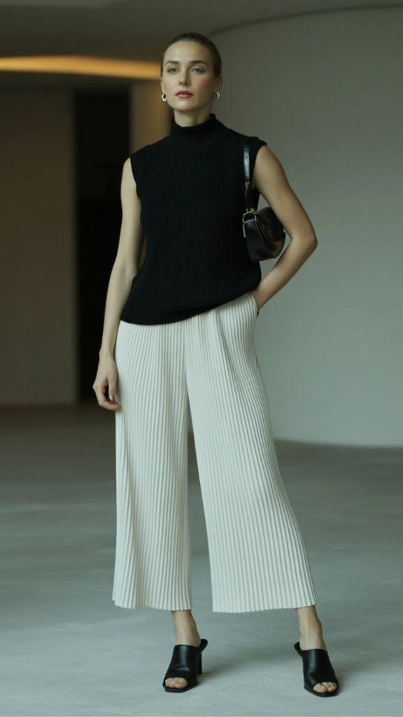 Black and white. Simple as that — and yet this outfit feels anything but basic. A sleeveless black mock neck knit, slightly fitted, paired with crisp ivory pleated culottes that fall in perfectly even accordion pleats to just above the ankle. The contrast is sharp but not harsh, and the overall effect is one of quiet modernism. If you’re looking for high waist pleated culottes that make a statement through structure alone, this is your template.