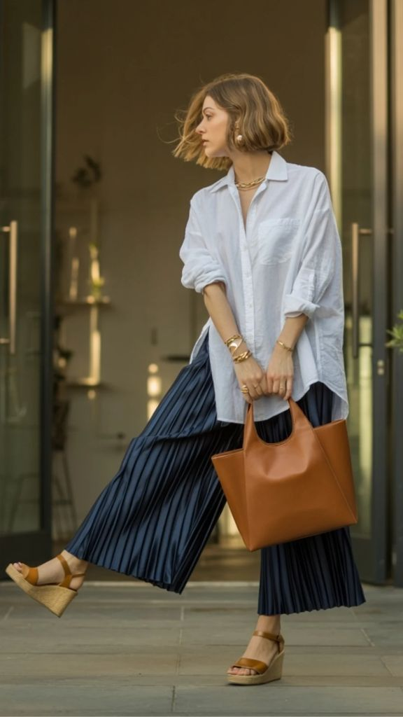 If I could only wear one outfit for the entire summer, it might be this one. An oversized white linen button-down — sleeves casually rolled to the elbow — billowing over wide-leg navy pleated culottes that have so much movement they almost look like a maxi skirt. Add tan wedge sandals, a cognac leather tote, and layered gold jewelry, and you have an outfit that is simultaneously relaxed and incredibly polished. This is lightweight summer pants women styling at its absolute peak.