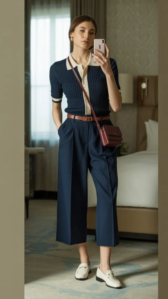 There’s a nostalgic elegance happening here that I can’t stop staring at. A navy ribbed polo knit with cream collar and cuff details, tucked into high-waisted navy tailored culottes, finished with a cognac belt and white loafers. It looks like it belongs in a 1970s Italian film — the kind where everyone is impossibly chic and slightly mysterious. The monochromatic navy palette is elevated by the preppy details, and the burgundy crossbody bag adds just the right amount of contrast. Summer culottes outfits 2026 are embracing this kind of retro sophistication, and I’m here for every bit of it.