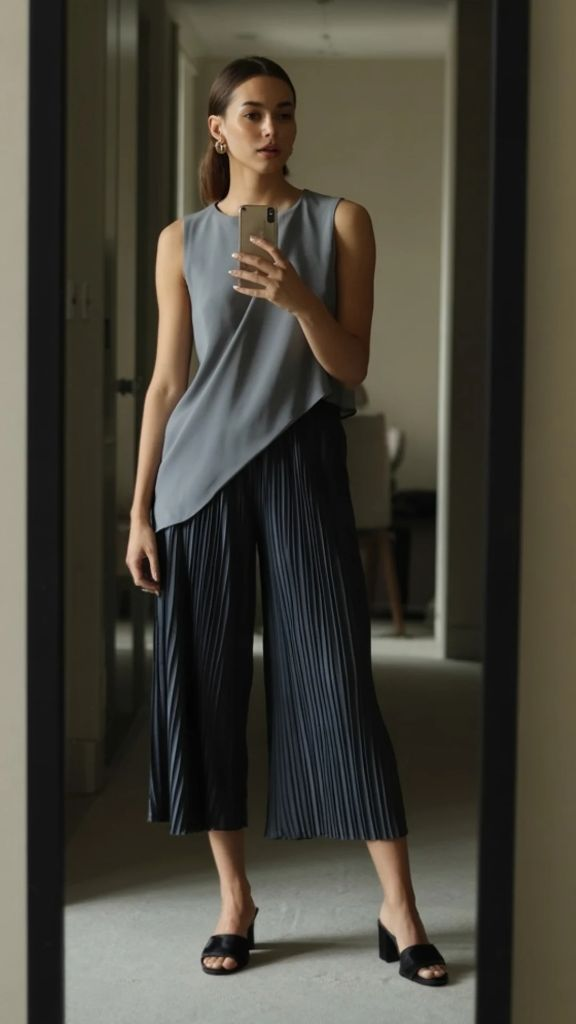 This look leans into the architectural side of fashion, and it’s striking. A dove grey asymmetric sleeveless blouse — the hem cut on a diagonal, creating visual movement even while standing still — paired with deep teal pleated culottes that cascade in fine accordion folds. The overall impression is sculptural, like something you’d see in a contemporary art gallery, which is fitting because this is an outfit that turns you into the most interesting thing in any room. Pleated culottes styling ideas get a modernist upgrade right here.