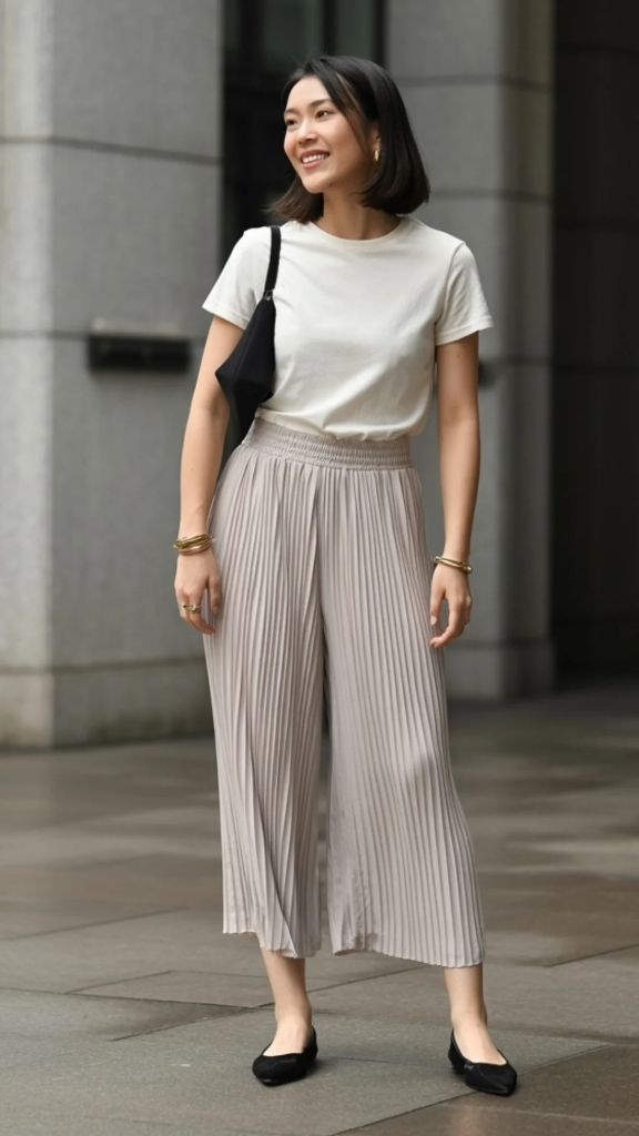 Sometimes the most beautiful outfit is the quietest one. A perfectly fitted white crewneck tee, tucked into dove grey pleated culottes with an elastic waist, finished with simple black ballet flats. That’s all. No statement bag, no dramatic jewelry — just a black shoulder bag and a few delicate gold bangles. And yet this look radiates a kind of effortless sophistication that louder outfits rarely achieve. Wide-leg summer culottes in a soft neutral tone like this are endlessly wearable and impossibly flattering.