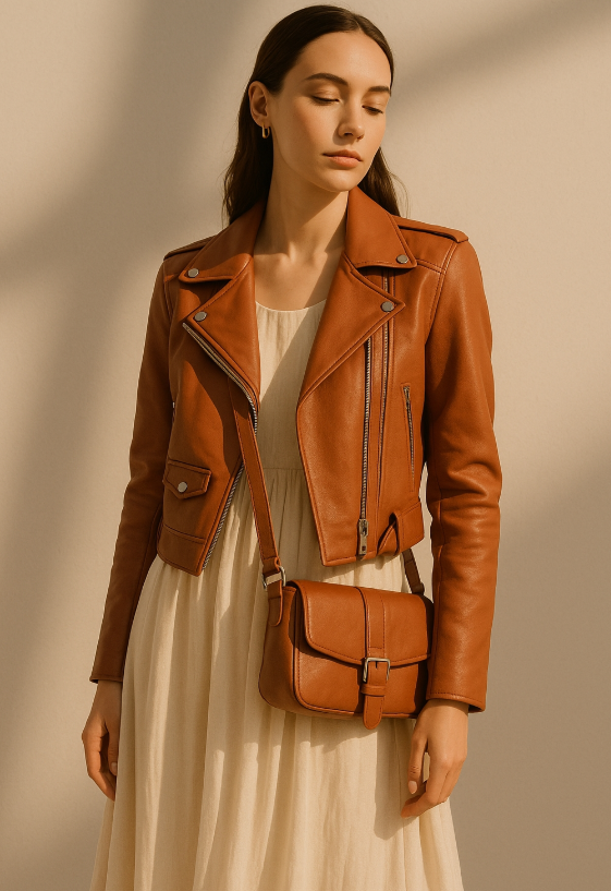 At the core of the Moto Boho aesthetic is the marriage of two timeless styles: the laid-back, romantic vibes of bohemian fashion with the raw, assertive energy of moto-inspired pieces. This image captures the essence perfectly—a flowing, cream-hued maxi dress creates movement and grace, while a structured terracotta leather biker jacket lends attitude and confidence.