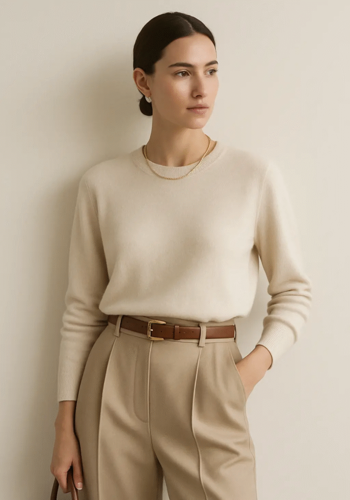 A major appeal of the Quiet Luxury trend is its adaptability. The cream sweater and beige trousers can carry you through a multitude of occasions—whether it’s a business meeting, date night, or weekend brunch. Swap out a heel for a loafer, or add a trench on colder days, and the entire look shifts effortlessly.