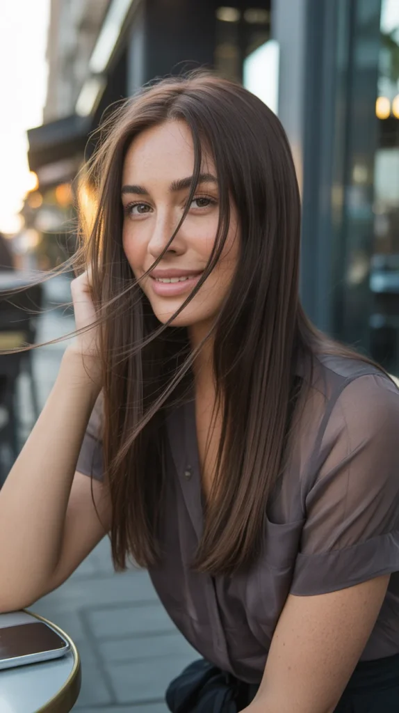 If warm brunette is spring’s daytime personality, then sleek espresso is her evening side. This look is all about depth — a rich, cool-toned brown that’s nearly black in shadow but reveals its true chocolate nature in sunlight. The long, straight texture here has just enough movement to keep it from feeling severe, and those wind-swept strands falling across the face add a cinematic quality I can’t stop thinking about. It’s a bright brown hair color in the most unexpected way — brightness through shine and clarity rather than lightness.