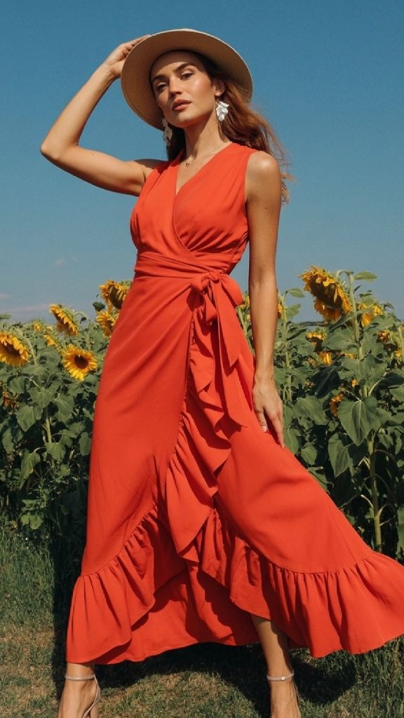 Some colors just belong to summer, and this deep red-orange sits right at the intersection of warmth, boldness, and romance. The wrap silhouette is timeless for a reason — it cinches at the waist, creates beautiful movement, and flatters curves in the most natural way possible. The ruffle hem adds a playful, slightly retro energy that keeps this dress from feeling too serious. Standing in a field of sunflowers or sitting across from someone at an outdoor restaurant, this is the kind of cute summer dress for women that generates compliments before you even sit down.