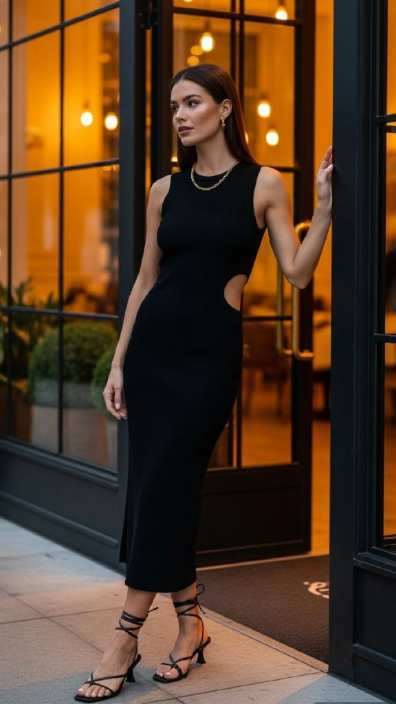 Every summer wardrobe needs a dress that means business after dark, and this sleek black midi with strategic side cut-outs is exactly that. The ribbed knit fabric hugs the body without feeling restrictive, and those subtle cut-out details at the waist add a modern, architectural element that elevates this far beyond a basic black dress. Paired with delicate strappy heels that lace up the ankle and a simple gold chain necklace, the whole effect is polished, confident, and undeniably cool. This is one of those elegant summer dress outfits that works for a rooftop dinner, a gallery opening, or any evening where you want to feel both powerful and effortlessly beautiful.