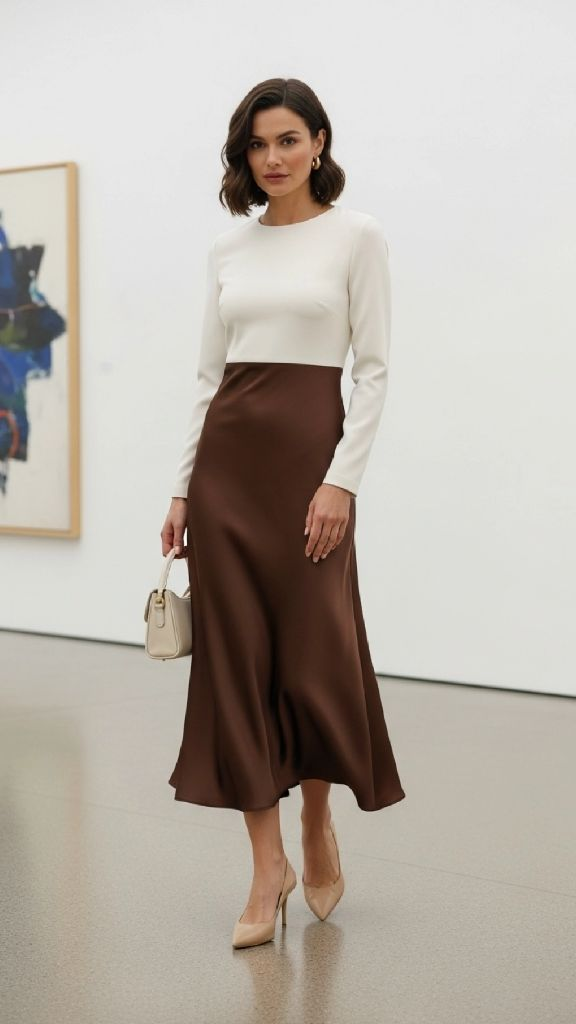 There’s a particular kind of elegance that comes from combining exactly two colors with precision, and this look masters it completely. The clean white top with its slightly structured shoulders meets a rich chocolate brown satin midi skirt that moves like liquid when you walk. Together, they create a dress-like silhouette that feels considered, artistic, and quietly commanding. The art gallery setting in the background isn’t accidental — this is a look that belongs in spaces where beauty and intention matter. For summer dress ideas 2026 that lean sophisticated, this two-tone approach is one of the most compelling directions I’ve seen.