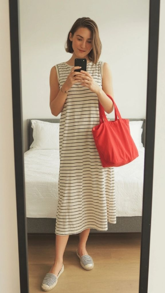 Not every summer dress needs to make a statement. Sometimes the best one is the dress you throw on without thinking — the one that feels like a second skin and somehow still looks completely put together. This sleeveless striped midi in cream and navy is exactly that kind of dress. The relaxed A-line cut skims rather than clings, the Breton-inspired stripes are eternally chic, and the matching striped espadrilles create a coordinated look that takes zero effort. The pop of a bright red tote bag is the only accent needed. This is the definition of casual summer sundresses done right.