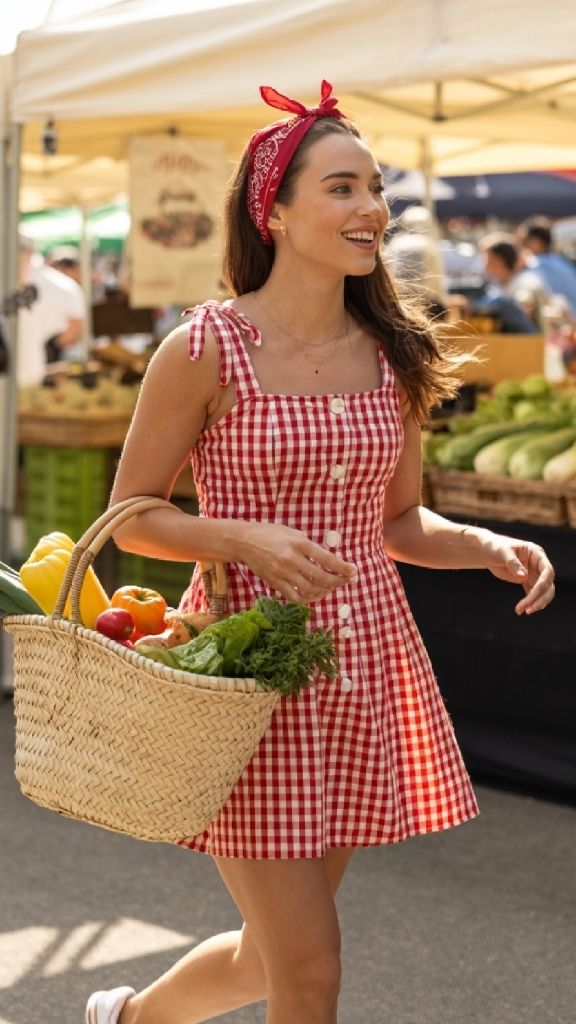 Brands like HVN and Batsheva do retro-inspired gingham beautifully, while Reformation offers more relaxed, everyday versions. The white sneakers keep this casual and walkable — this is not a dress that asks you to suffer in heels. The red bandana is a detail I love because it connects the headband to the gingham and creates a story within the outfit.