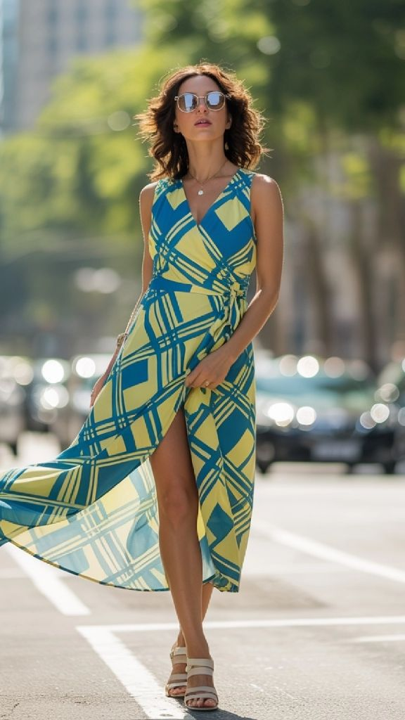 Color-blocking meets abstract geometry in this stunning wrap maxi that demands attention in the most artful way possible. The bold interplay of chartreuse yellow and deep teal creates a visual rhythm that feels modern and almost painterly, and the wrap construction means the dress adjusts to your body rather than the other way around. The fabric catches the wind with a gorgeous sweeping motion, and the subtle slit adds movement and a flash of leg. Among flowy summer dresses women are wearing this season, this graphic print approach feels distinctly forward-thinking.