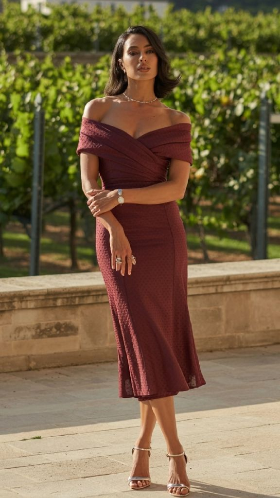 There’s a reason burgundy keeps appearing in summer collections even though we associate it with autumn — when done right, it carries a warmth and depth that feels incredibly romantic in evening light. This off-shoulder midi with its beautifully draped bodice and subtle Swiss dot texture is a masterclass in understated sophistication. The way the fabric crosses over the shoulders creates a sculptural frame for the face and décolletage, and the midi length with its slight flare at the hem is universally flattering. The vineyard setting says everything about where this dress belongs — lingering dinners, wine tastings, late summer celebrations.