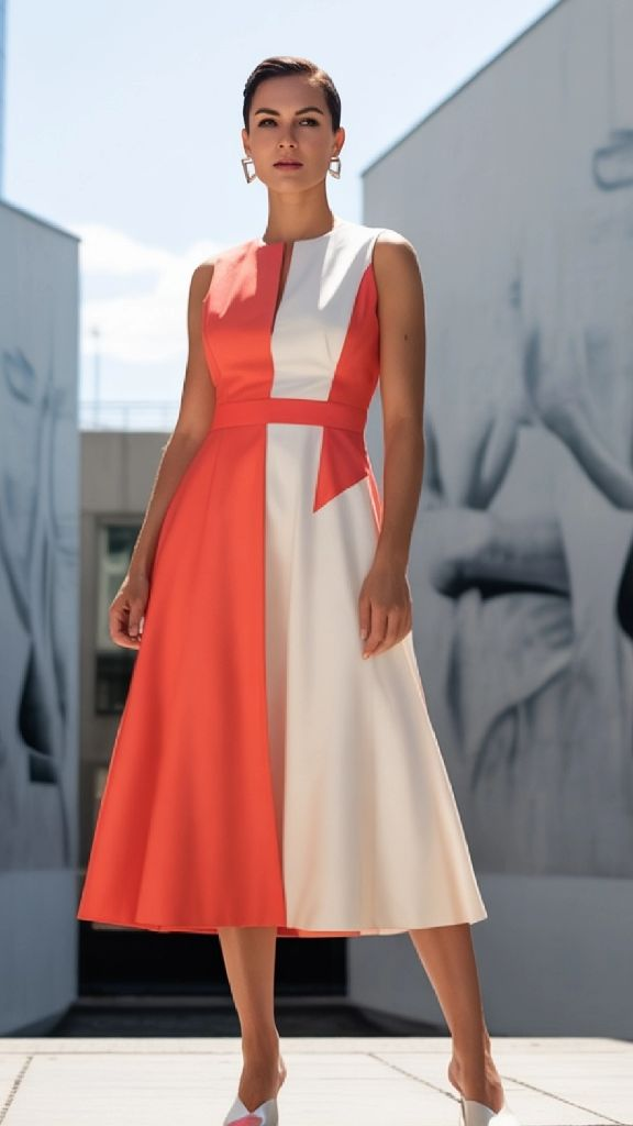 Color-blocking done with precision feels less like a trend and more like art, and this coral-and-cream A-line midi is a perfect example. The geometric panels of vibrant coral and soft cream create visual interest that’s graphic and modern without being aggressive. The sleeveless cut keeps it summery, and the A-line skirt has that satisfying mid-century swing that looks incredible in motion. The structured shoulders and clean neckline give this dress an almost architectural quality — it’s clearly designed with intention. Among summer dress ideas 2026 that push creative boundaries while remaining completely wearable, this color-block approach is a standout.