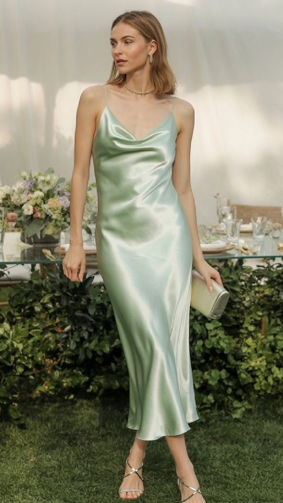 Brands like Abercrombie’s elevated line and Princess Polly have been producing sage satin slip dresses that look far more expensive than they are. The champagne clutch and nude strappy sandals create a tonal palette that’s deliberately soft and cohesive. A delicate pendant necklace is all the jewelry this dress needs.