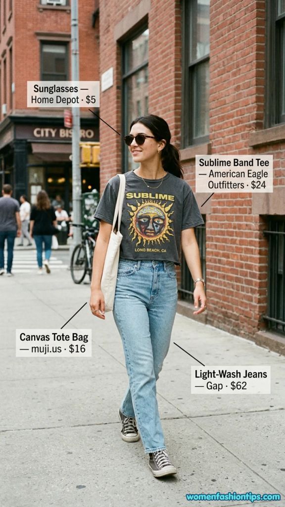 Shop This Look: The Sublime Band Tee is from American Eagle Outfitters at $24 — shop it here. The Light-Wash Jeans by Gap for $62 — grab them here. The Canvas Tote Bag from Muji at $16 — find it here. And the Sunglasses from Home Depot at $5 — snag them here.