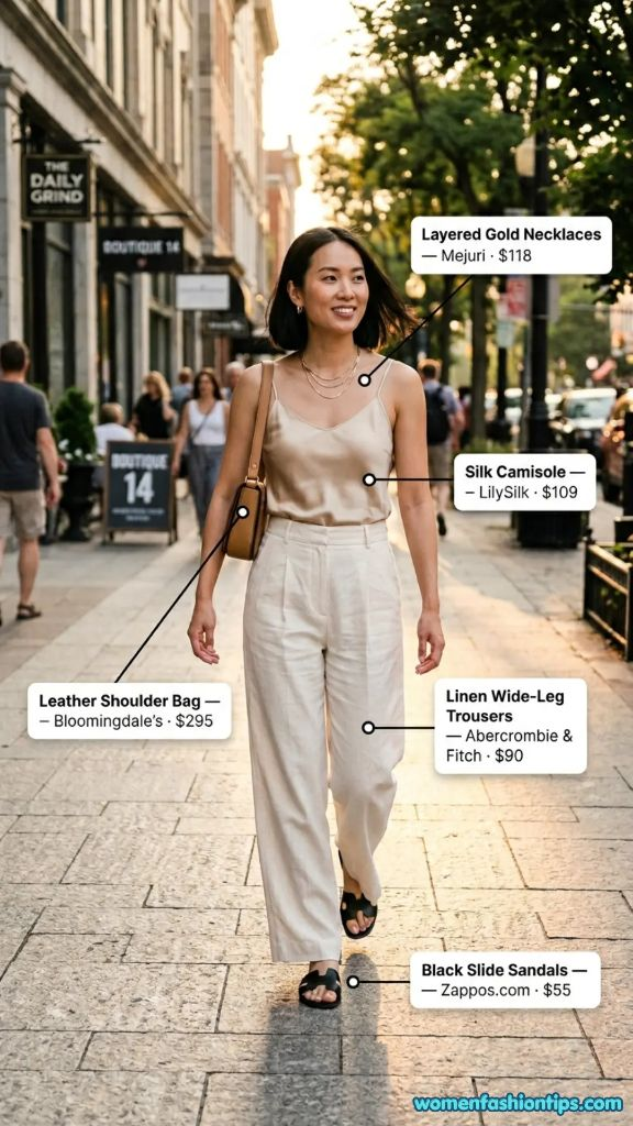 Shop This Look: The Silk Camisole is from LilySilk at $109 — shop it here. The Linen Wide-Leg Trousers by Abercrombie & Fitch for $90 — grab them here. The Leather Shoulder Bag from Bloomingdale’s at $295 — find it here. The Layered Gold Necklaces from Mejuri at $118 — snag them here. And the Black Slide Sandals from Zappos.com at $55 — pick them up here.